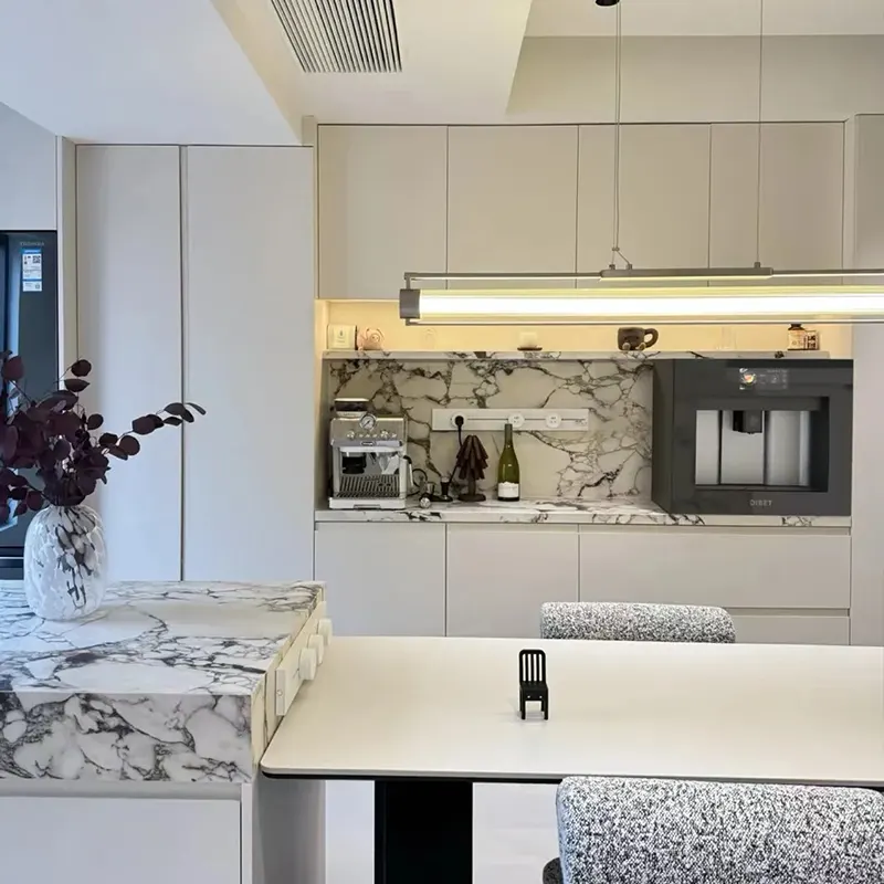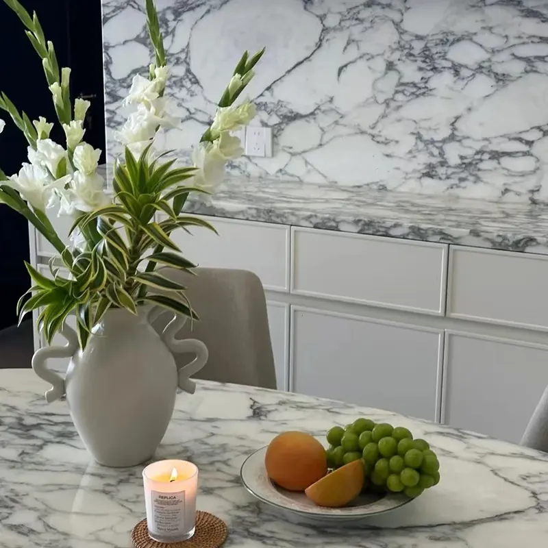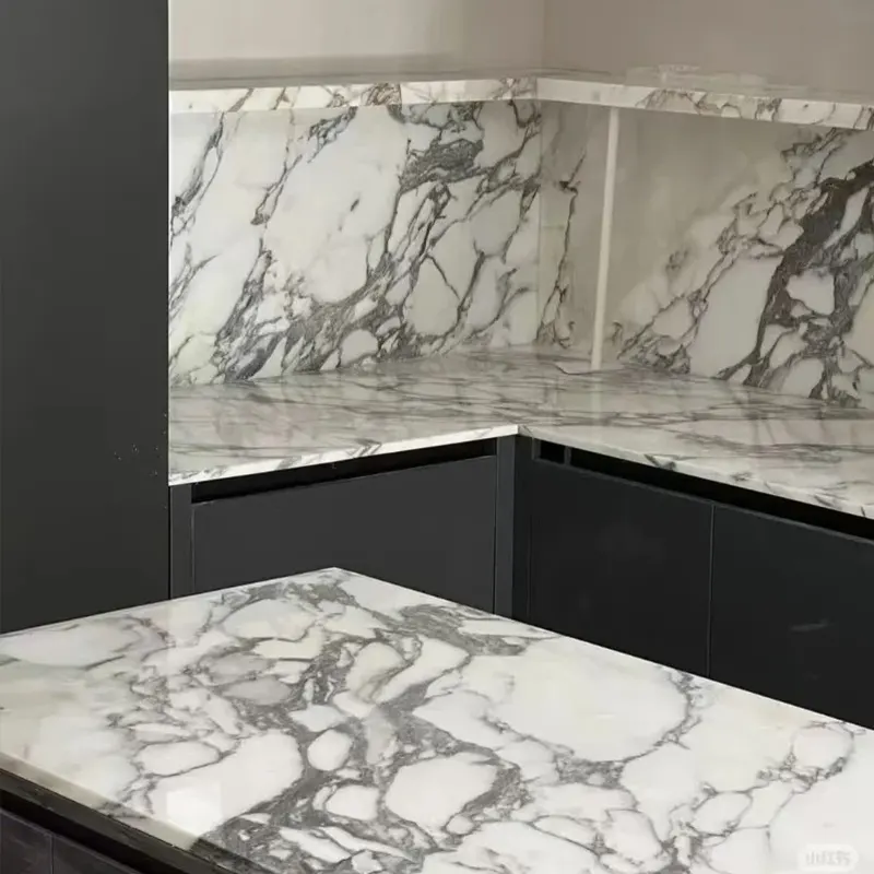 Arabescato 대리석 주방 카운터와 섬 탑의 능력은 식당과 요리 공간에서 빛과 우아함을 강조 할 수있는 능력으로 인해 많은 것을 찾고 있습니다. 그들은 목재 캐비닛이나 고광택 마감을 꽤 멋지게 강조합니다.