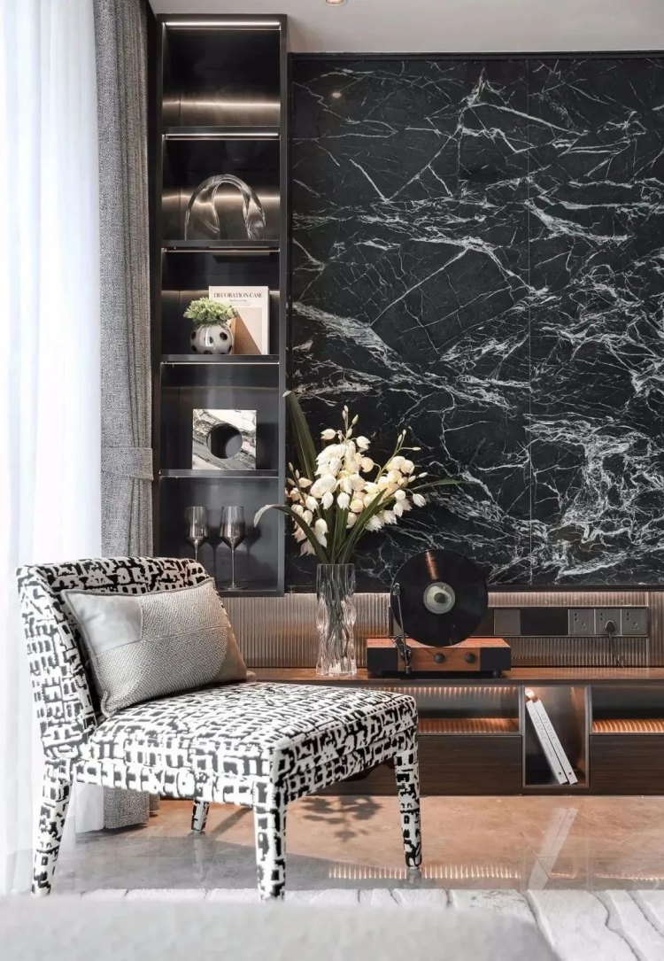 검은 대리석을 사용하여 방은 즉시 더 극적이고 우아하게 만들어집니다. 바닥, 도어 프레임 또는 어두운 배경과 눈길을 끄는 정맥의 악센트 조각에서 멋지게 보입니다. 너무 많은 검은 색이 때때로 방에 쌀쌀하거나 무거운 느낌을 줄 수 있으므로 드물게 사용하십시오.